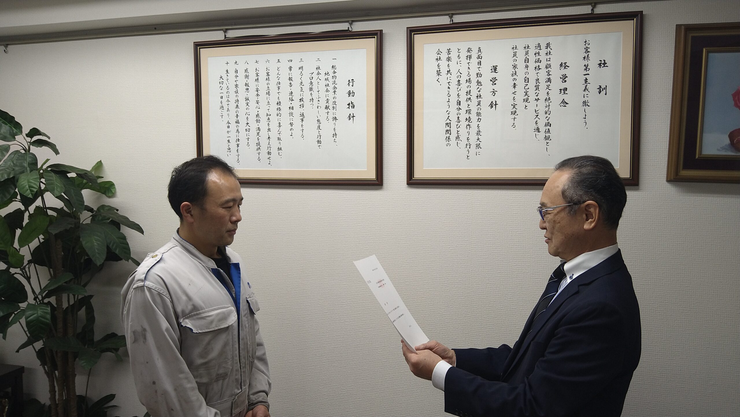 【辞令交付】新任の工場長です【埼玉県越谷市の運送会社は吉川自動車運送】