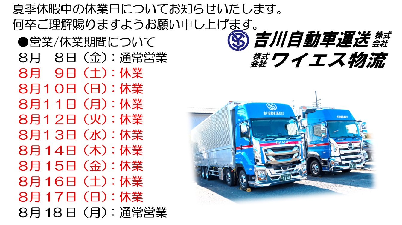8/9(土)~8/17(日)お休みさせて頂きます。【埼玉県越谷市の運送会社は吉川自動車運送】