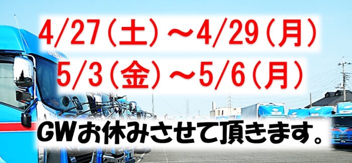 4/27~4/29、5/3~5/6お休みさせて頂きます。【埼玉県越谷市の運送会社は吉川自動車運送】 -