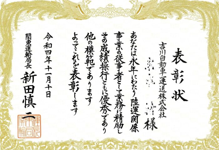 関東運輸局長表彰【埼玉県越谷市の運送会社は吉川自動車運送】 -